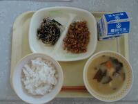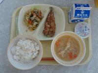 ごはん 牛乳 だいずとこざかなの米粉あげがらめ いそあえ ぐだくさんじる