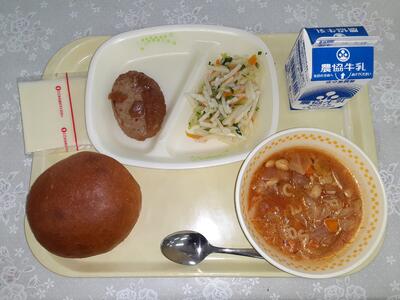 アップル米粉パン 牛乳 お米ささみカツ じゃことチーズのカルシウムサラダ ABCトマトスープ