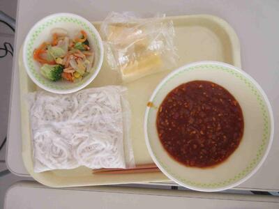 〇牛乳 〇米粉のミートソース 〇アーモンドサラダ 〇冷凍パイン